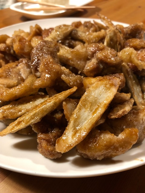 揚げた鶏モモ肉揚げたゴボウ醤油砂糖みりん甘辛いタレにからめた料理」